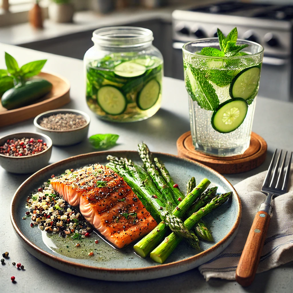 - 오이: 체내 수분 균형을 유지하고 노폐물 배출을 돕습니다.