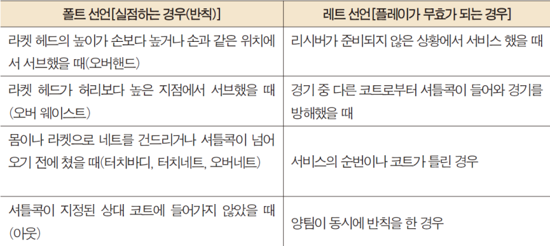 예를 들어 서브를 할 때 라켓의 헤드가 손보다 높거나, 셔틀콕이 네트를 넘어가기 전에 타격되는 경우가 있습니다.
